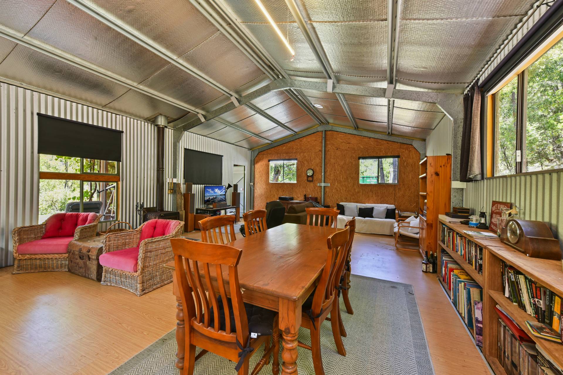The cosy retreat comprises a double insulated main spacious open area fully equipped with a kitchenette, living and dining spaces and a slow combustion fire place that adjoin and look over a north facing covered outdoor verandah. A separate private sleeping quarters provides the perfect place to rest after exploring your own wilderness back yard. The retreat also features an internal tiled wash/mud room as well as a 1.5kw solar system and lock-up internal storage/workshop area with a roller door.